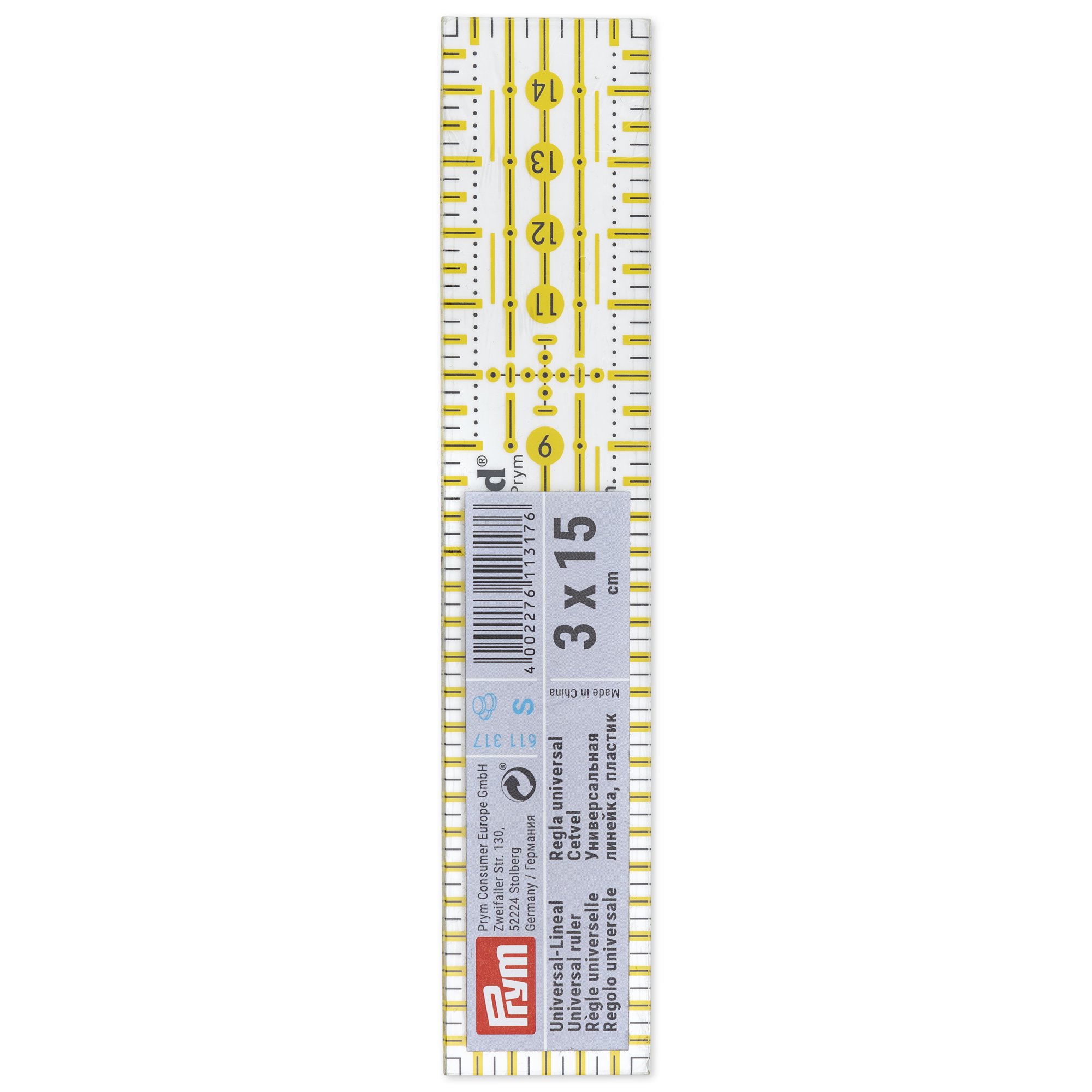 Ya sea en la mesa de corte o en la máquina de coser: las reglas universales Omnigrid de Prym son compañeras indispensables para trabajos de patchwork, costura y sastrería o para trabajos gráficos. Las marcas de cuadrícula amarillas y negras en escala métrica o en pulgadas permiten marcar con precisión tanto en telas oscuras como claras. La impresión láser resistente a los arañazos en la parte inferior de la regla evita distorsiones visuales. El material grueso, resistente y duradero garantiza un guiado seguro de los cutters rotatorios y los cutters artísticos sobre la base de corte. Algunas versiones de las reglas Omnigrid también tienen marcas de ángulo de 30, 45 y 60 grados para cortar triángulos, rombos y tiras al bies. Para mantener el orden, se puede colgar por su ojal.